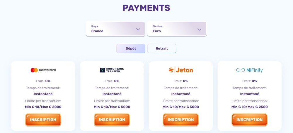 En ce qui concerne les options de dépôt à SlotsPalace, les joueurs ont plusieurs choix pour approvisionner leurs comptes. Le tableau ci-dessous présente les méthodes de dépôt disponibles, offrant une vue d’ensemble des options de paiement prises en charge par la plateforme :